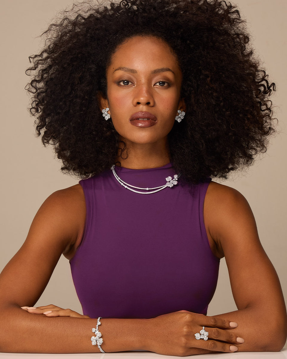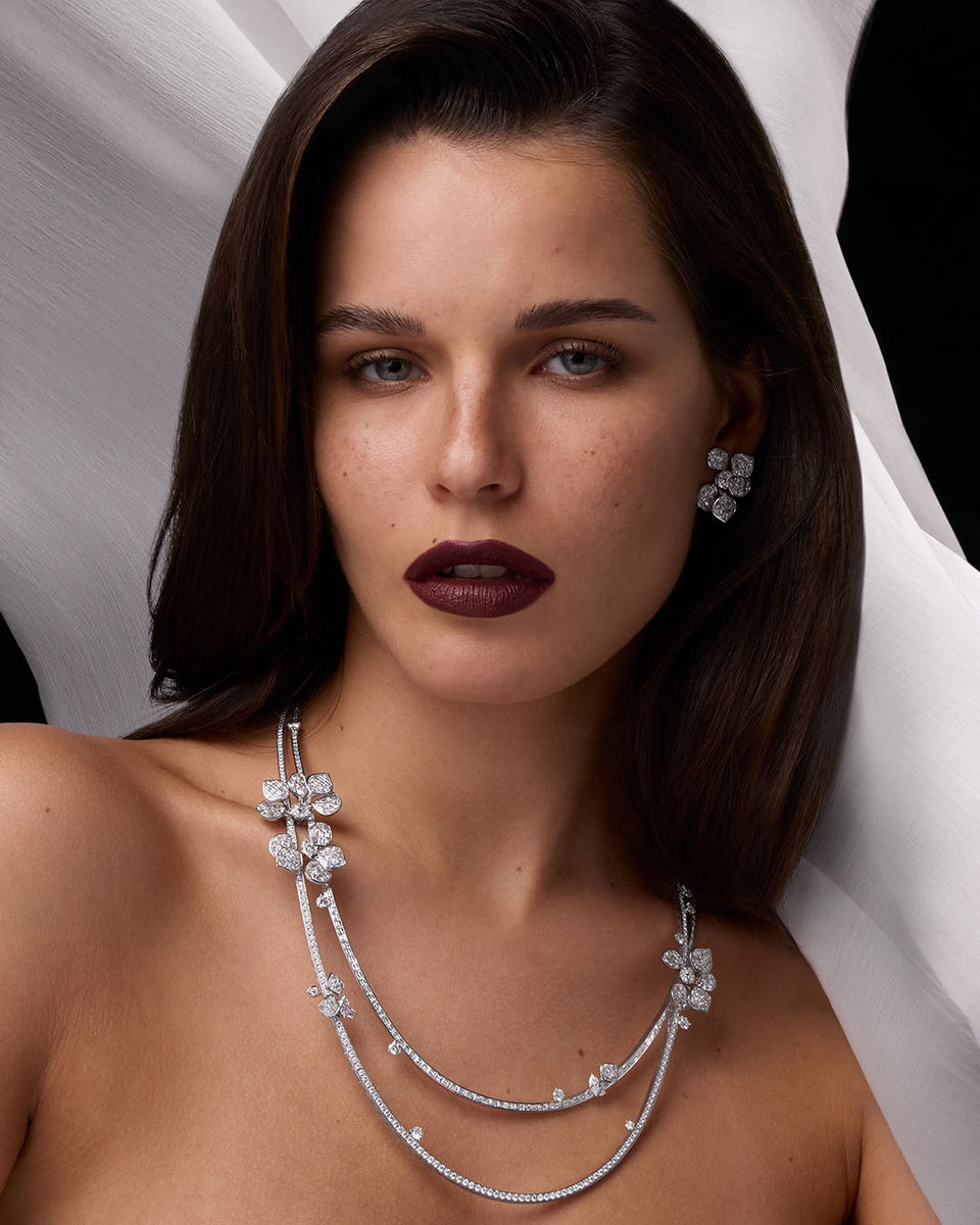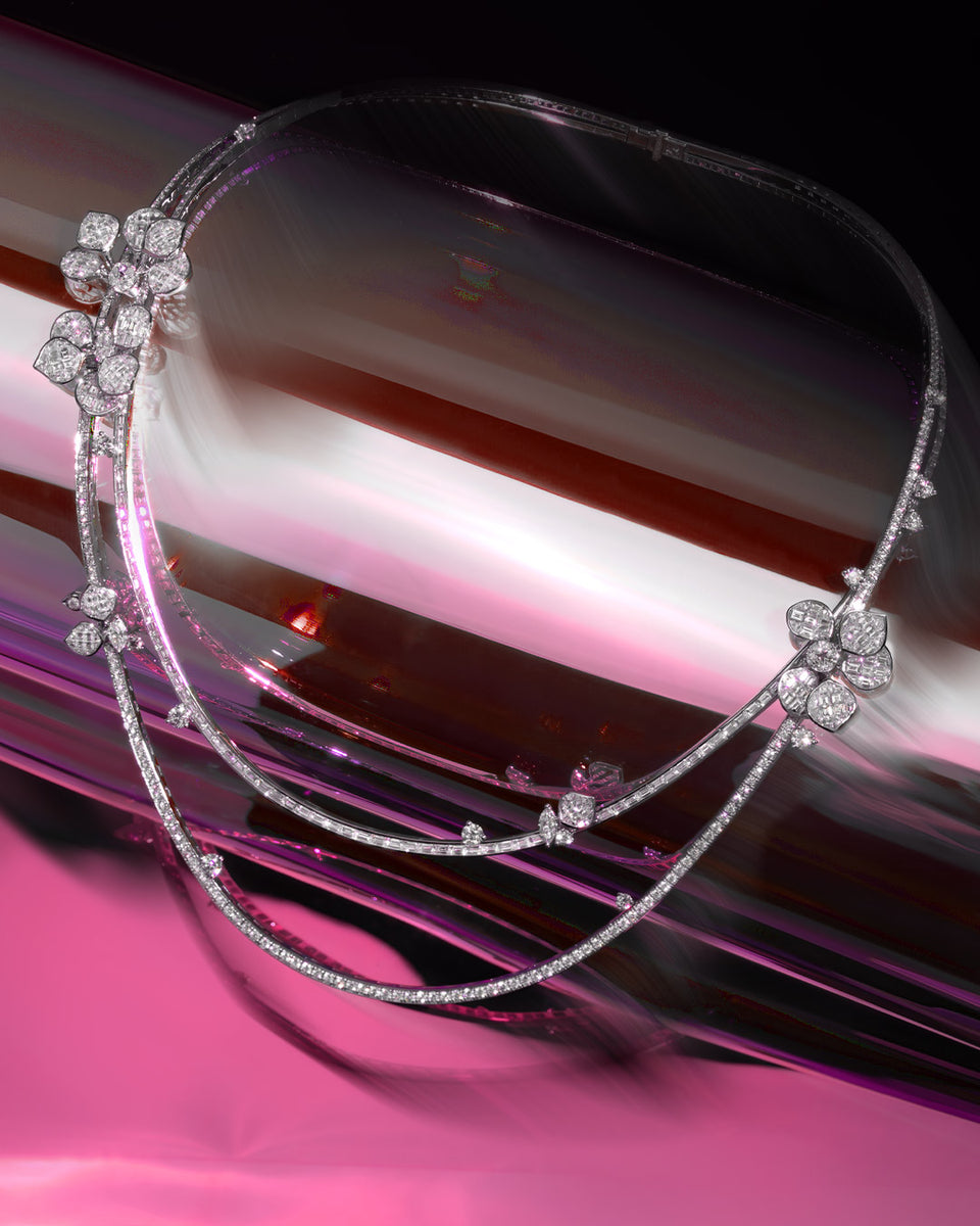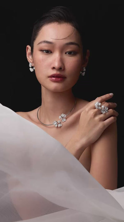 Dieser unvergleichliche Moment wurde in einer außergewöhnlichen Kollektion verewigt, die die Essenz dieser exquisiten Szene einfängt. Die Kollektion zeigt eine lebendige Verschmelzung aus verschlungenen Blütenblättern, die mit funkelnden Diamanten, rosa Saphiren und unsichtbar gefassten Rubinen geschmückt sind.