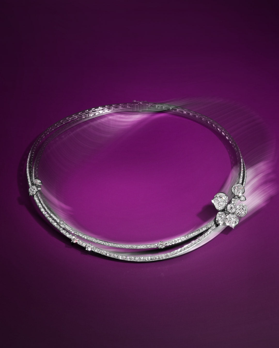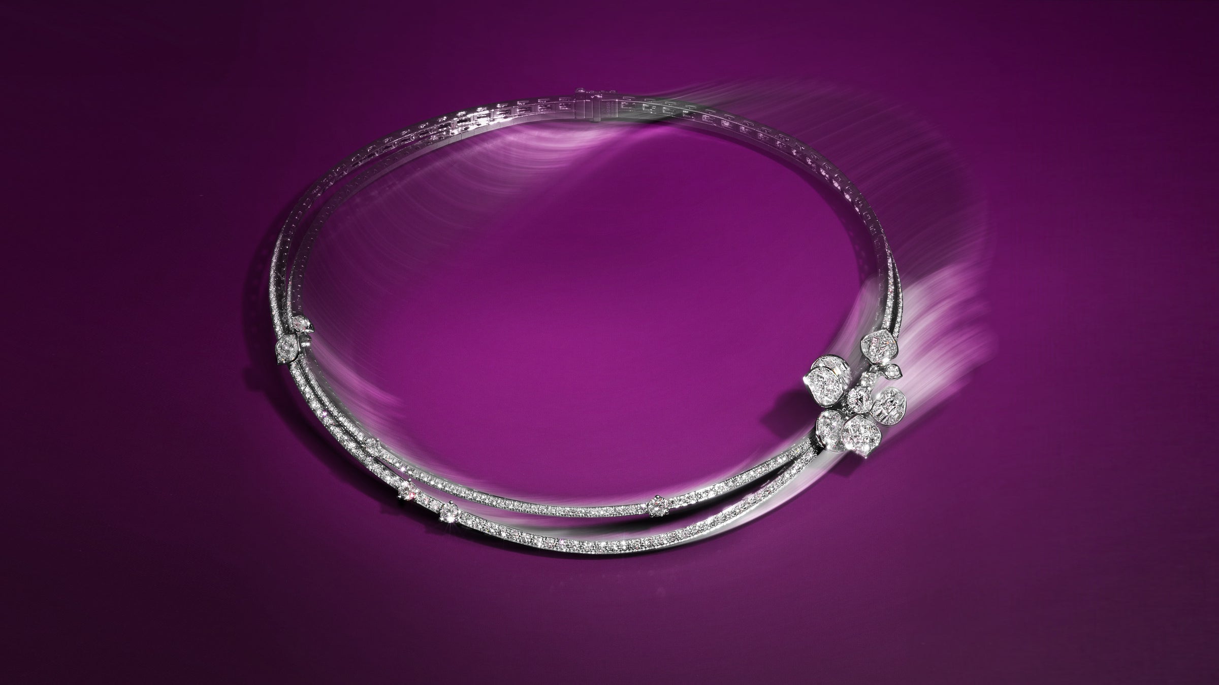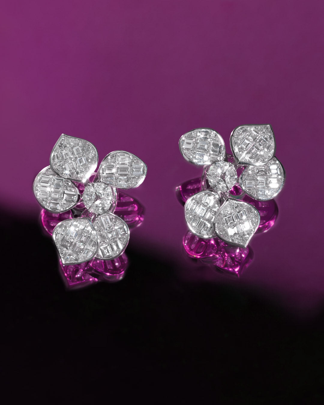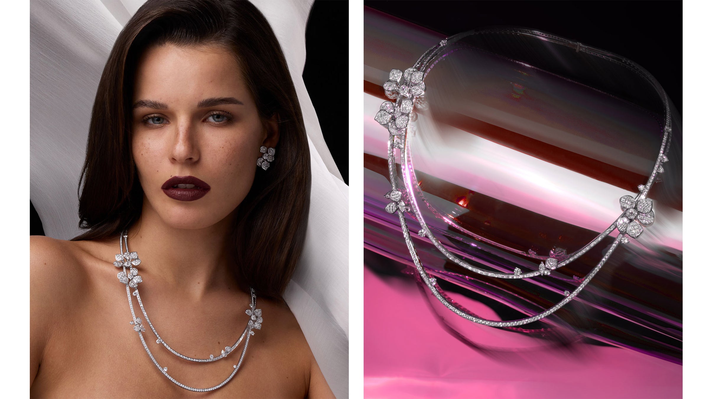 Dieser unvergleichliche Moment wurde in einer außergewöhnlichen Kollektion verewigt, die die Essenz dieser exquisiten Szene einfängt. Die Kollektion zeigt eine lebendige Verschmelzung aus verschlungenen Blütenblättern, die mit funkelnden Diamanten, rosa Saphiren und unsichtbar gefassten Rubinen geschmückt sind.