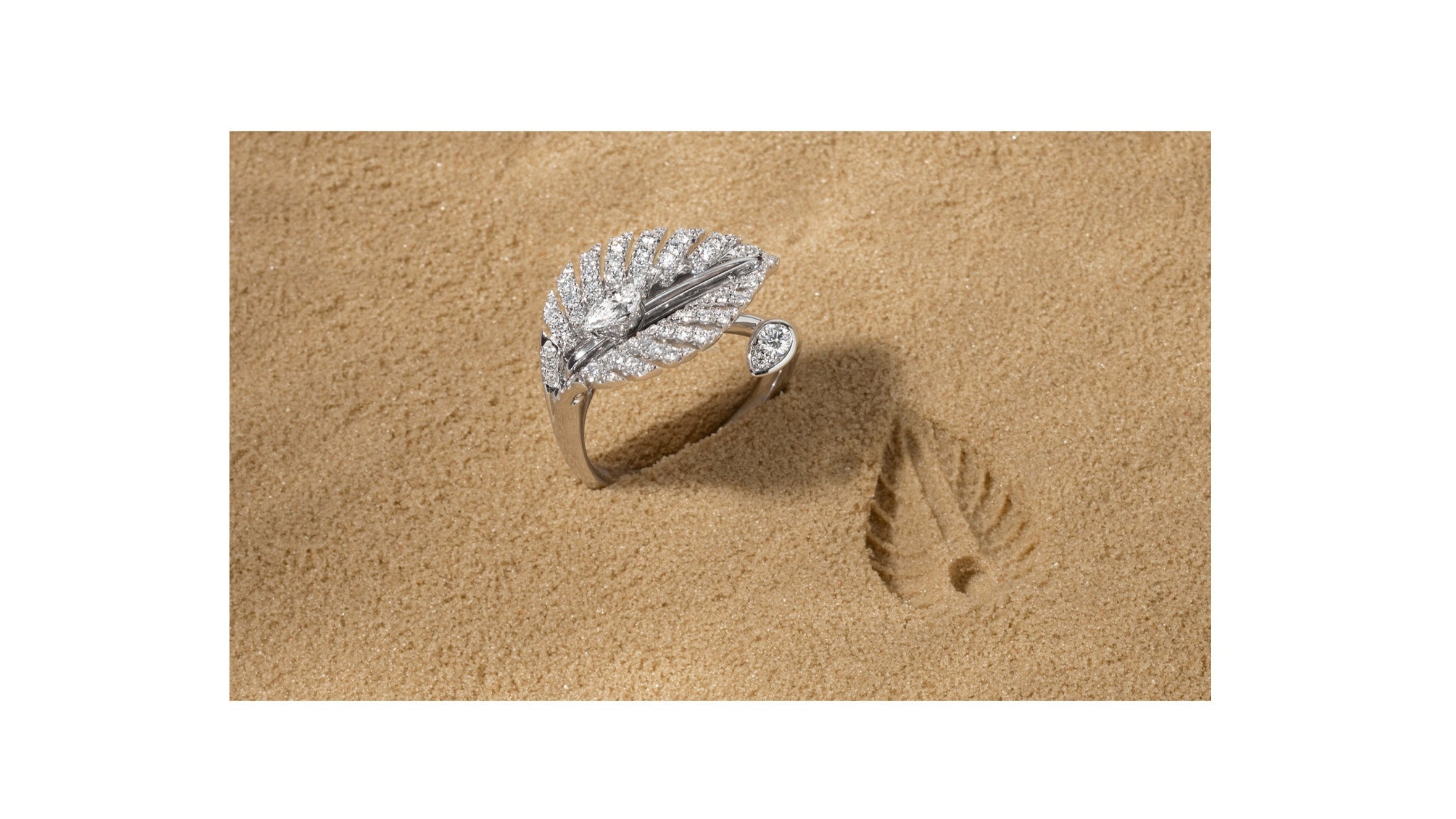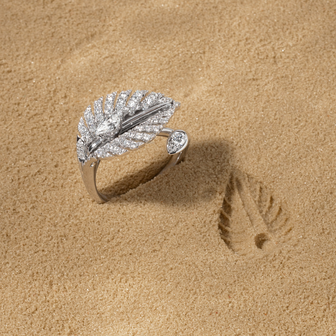 どんなシーンでもクールダウンできるよう特別にデザインされた、目に見えないペアシェイプのダイヤモンドのセットは、小さな水の泡が葉を伝うように、あなたの心を動かすようにカットされています。このコレクションのデザインは、日本、韓国、中国原産のオオバコ科の植物、ホスタの美しい葉からインスピレーションを得ています。ホスタは友情と献身を象徴する植物です。