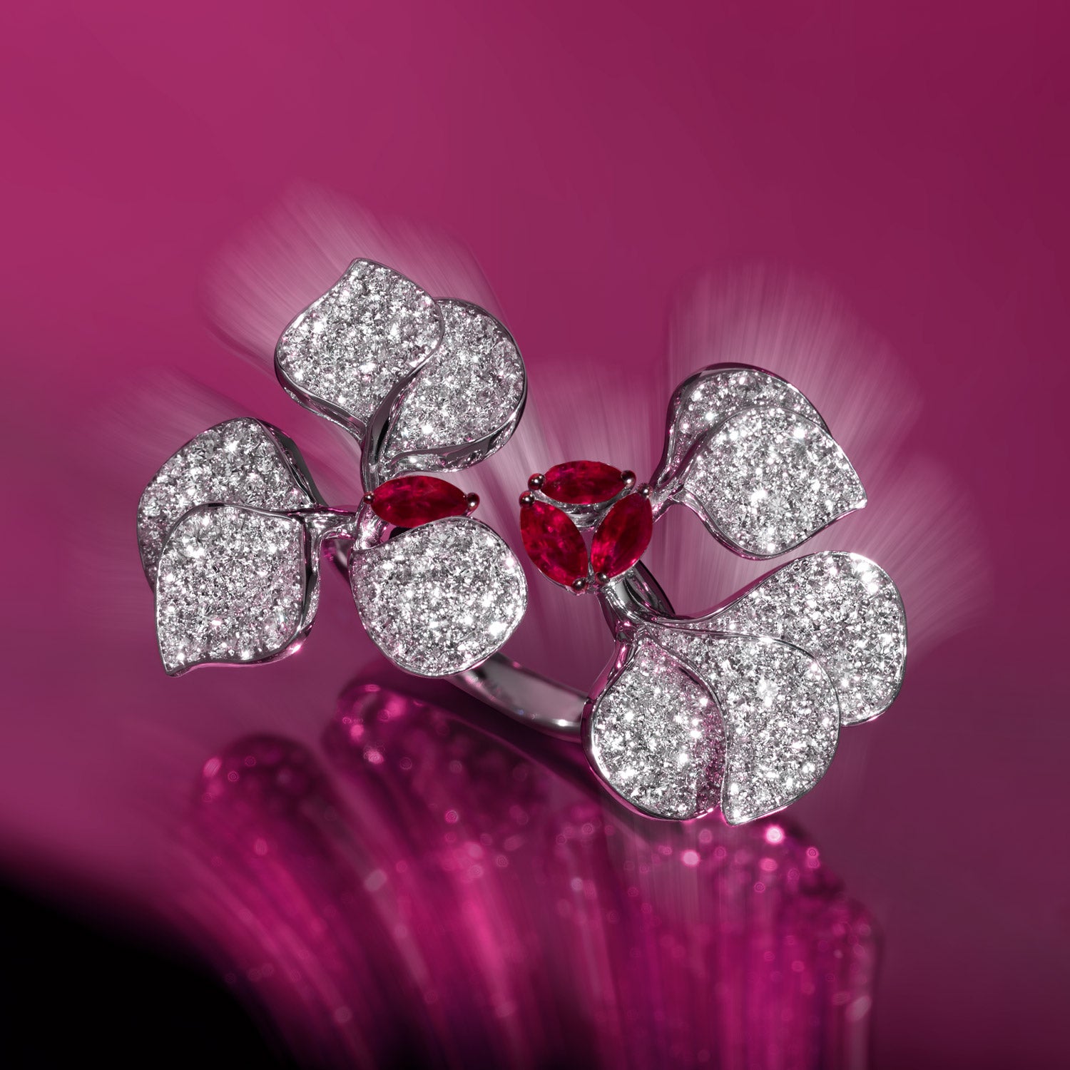 تُجسّد أحجار الياقوت المقطوعة على شكل ماركيز جوهر الأزهار المتفتحة، فتمنحك لمحة عن مجموعة الألوان الرائعة التي تزدهر خلال هذا الوقت السحري. تحمل كل ياقوتة بداخلها كل العاطفة والحيوية التي يمكن أن تجدها وسط حدائق باريسية مزهرة.